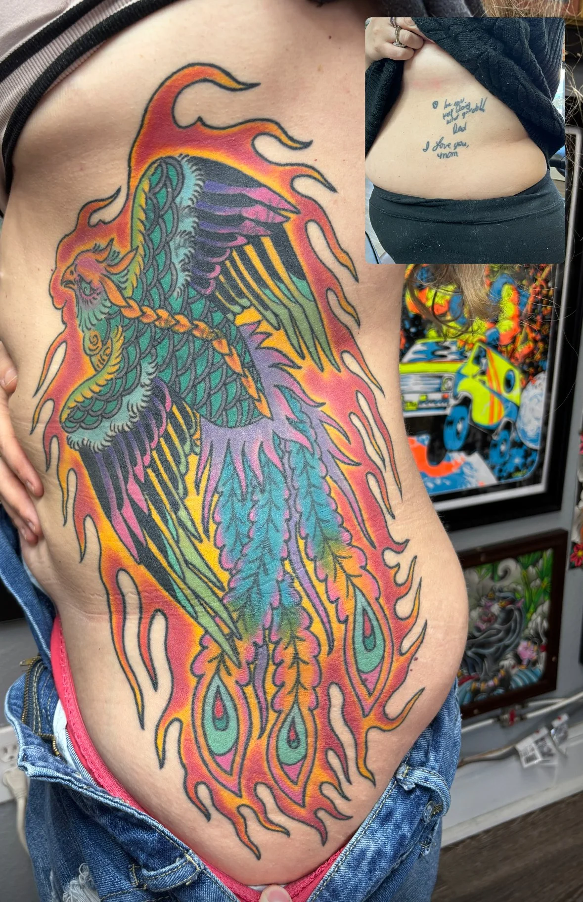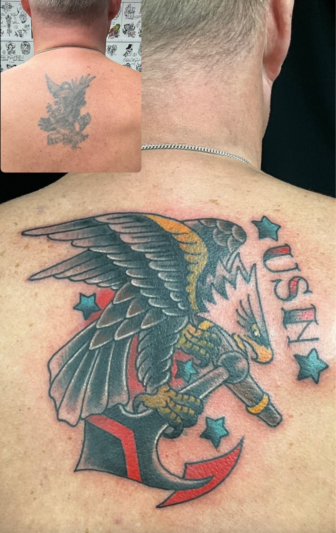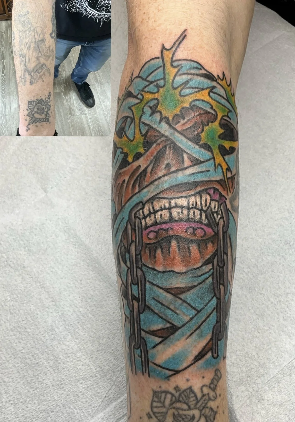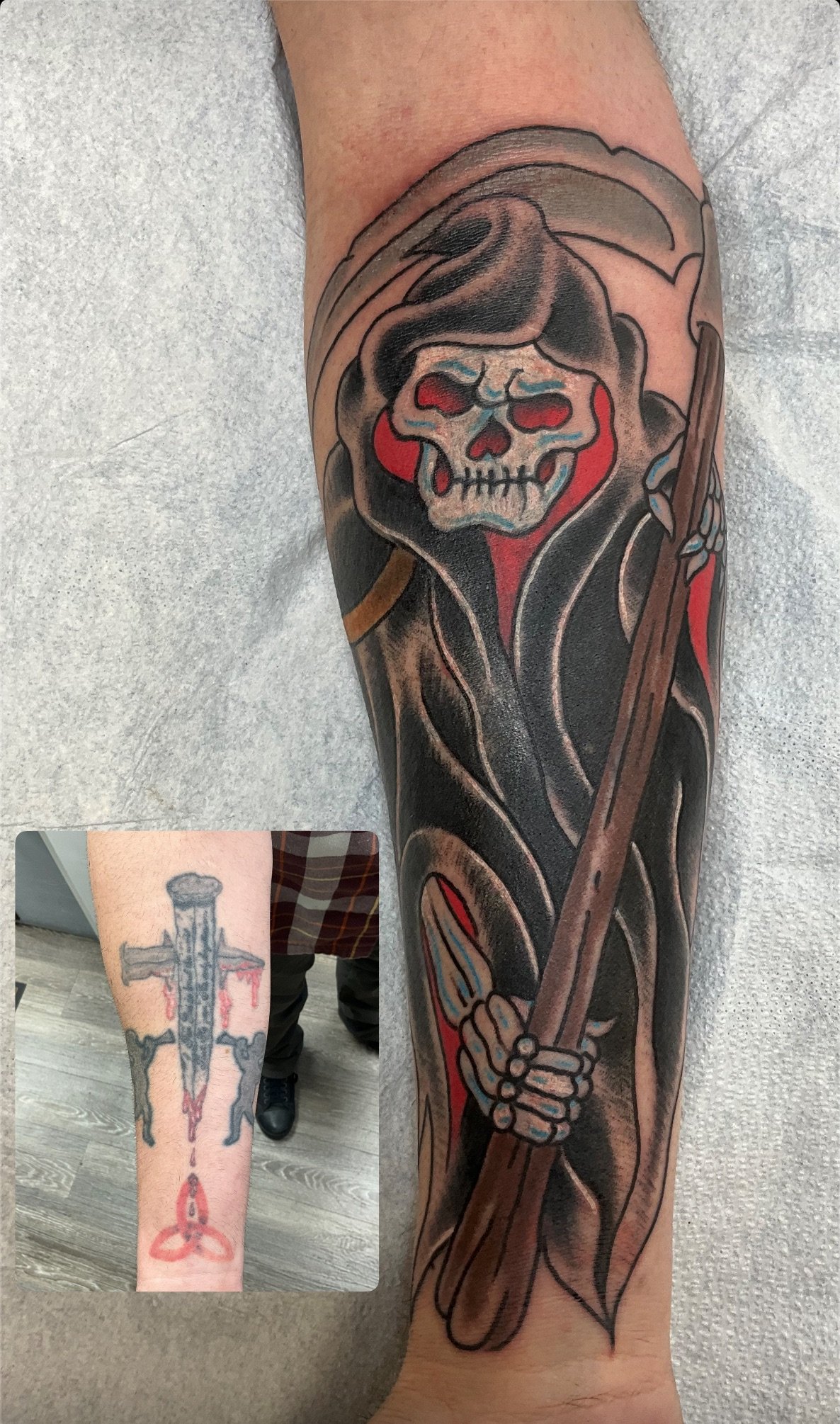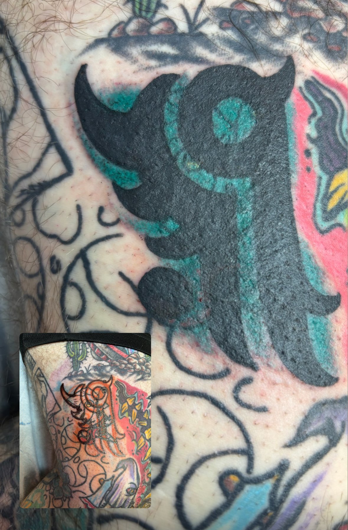 There are cover up tattoos and there are blast overs. Cover ups use different design elements to completly and artisticly cover the old design. A blast over unapolageticly covers the old work with little to no regard if any of the old tattoo shows through. There is a time and place for both. Tapping the picture will take you to the artist’s portfolio and booking information. Contact the artist to discuss your design idea!